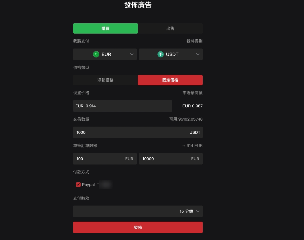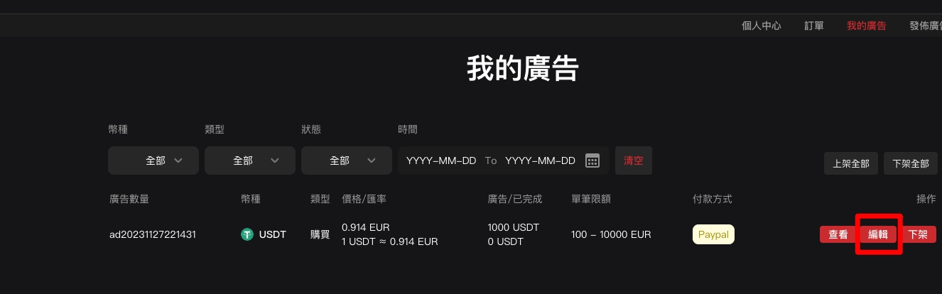 進入廣告詳情,您可編輯廣告的基本信息,如價格、時限、交易限額等。
