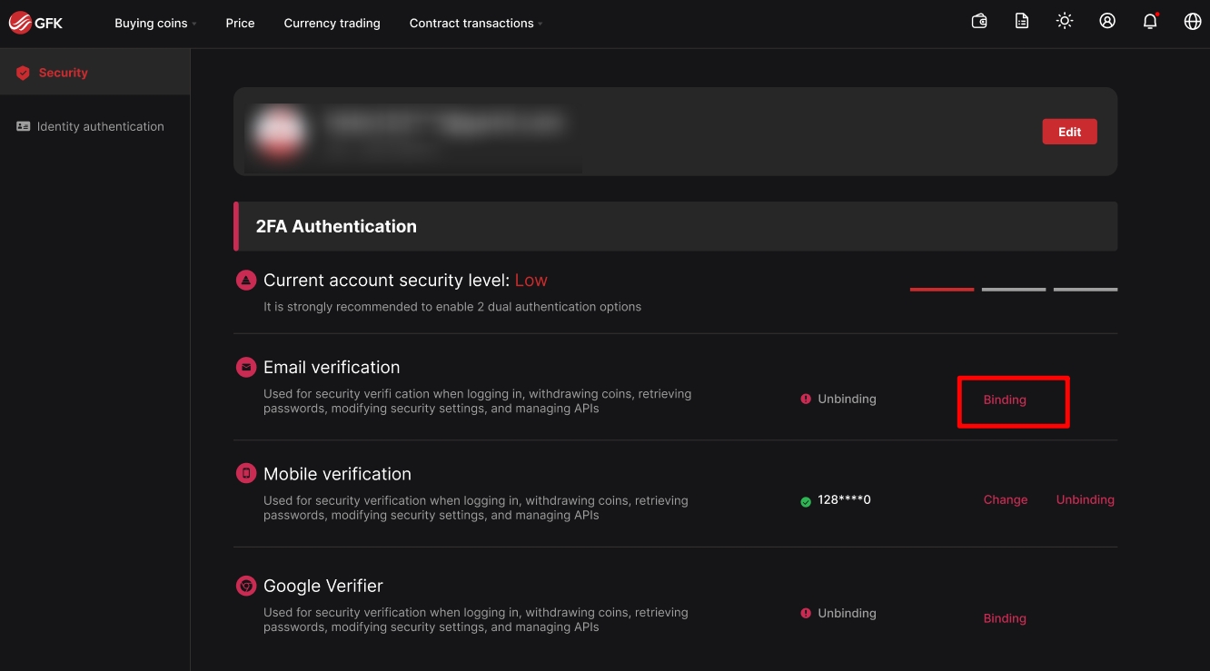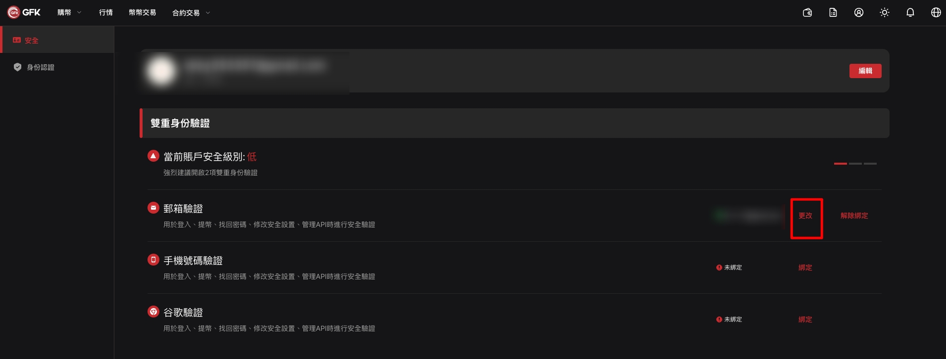 為了保護您的資產安全,在GFK平台更改、解綁電郵後,您的賬戶將禁用支付服務、提幣和C2C賣幣24小時。