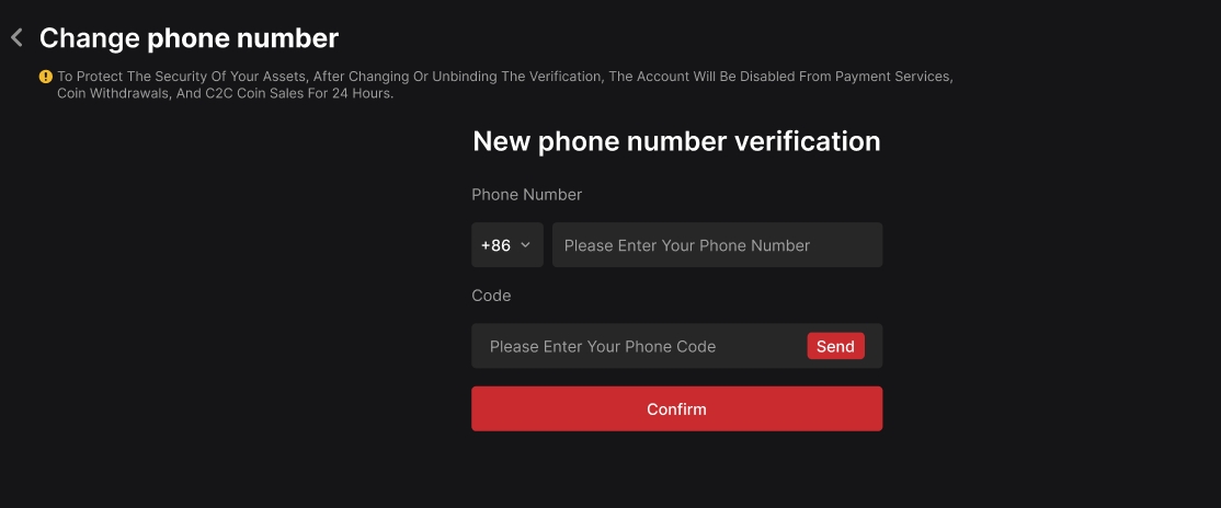 為了保護您的資產安全,在GFK平台更改、解綁手機號後,您的賬戶將禁用支付服務、提幣和C2C賣幣24小時。