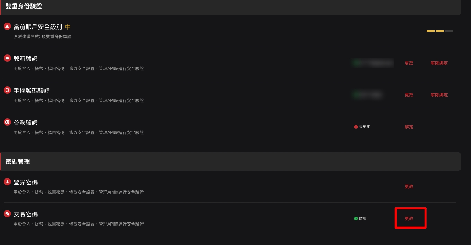 選擇「交易密碼」,點擊「更改」。