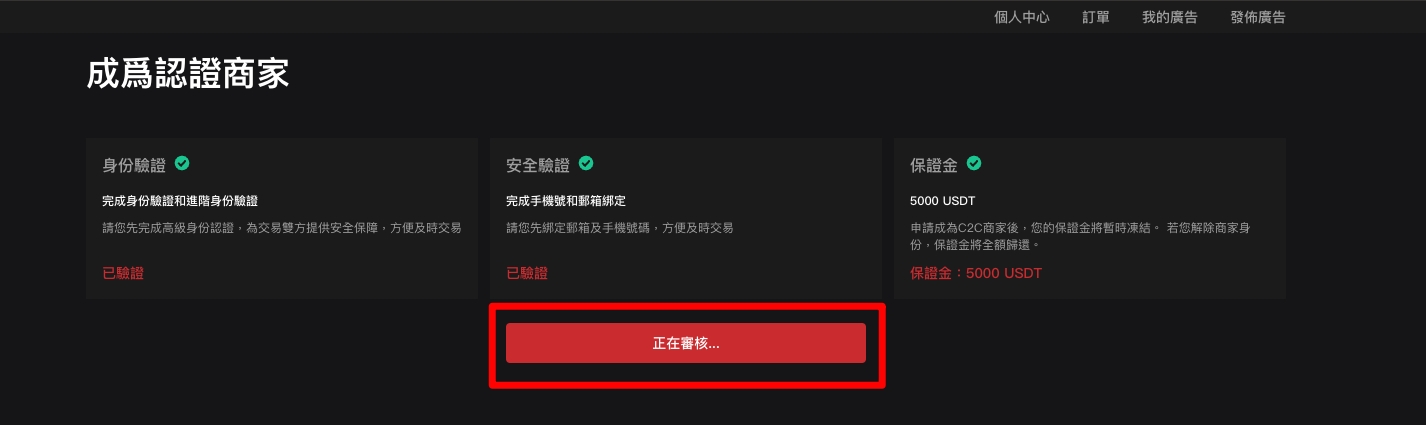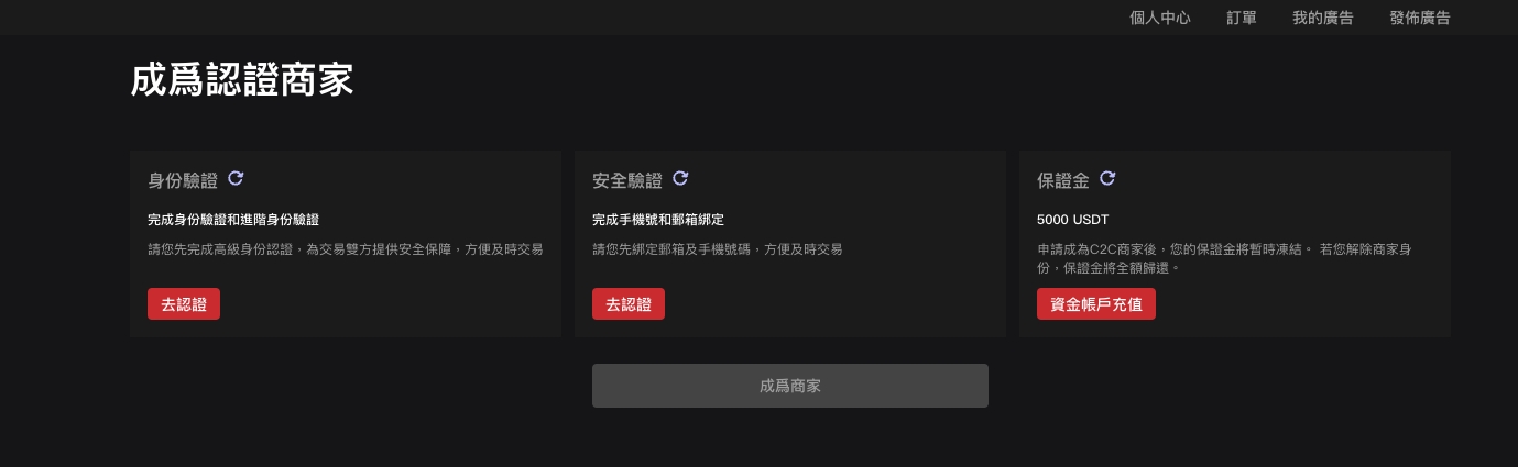 保證金將在商家申請提交時受凍結,保證金額將展示在使用者資料頁面。 如果申請被拒絕,保證金額將被解凍。點擊「申請」。