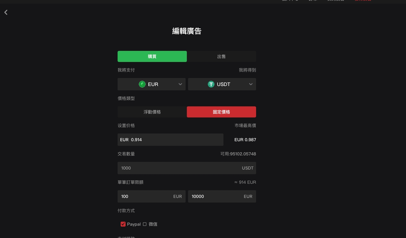 進入廣告詳情,您可編輯廣告的基本信息,如價格、時限、交易限額等。