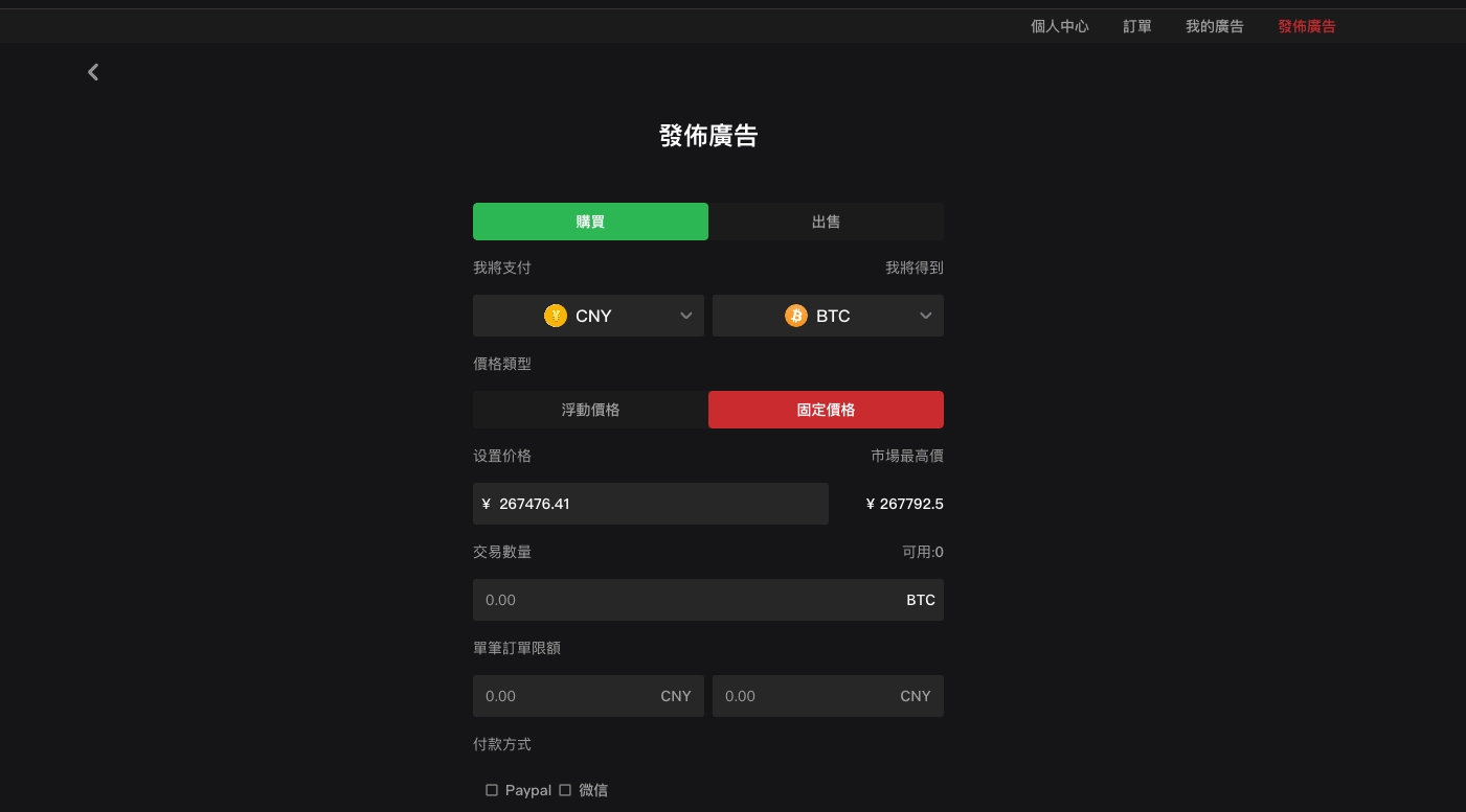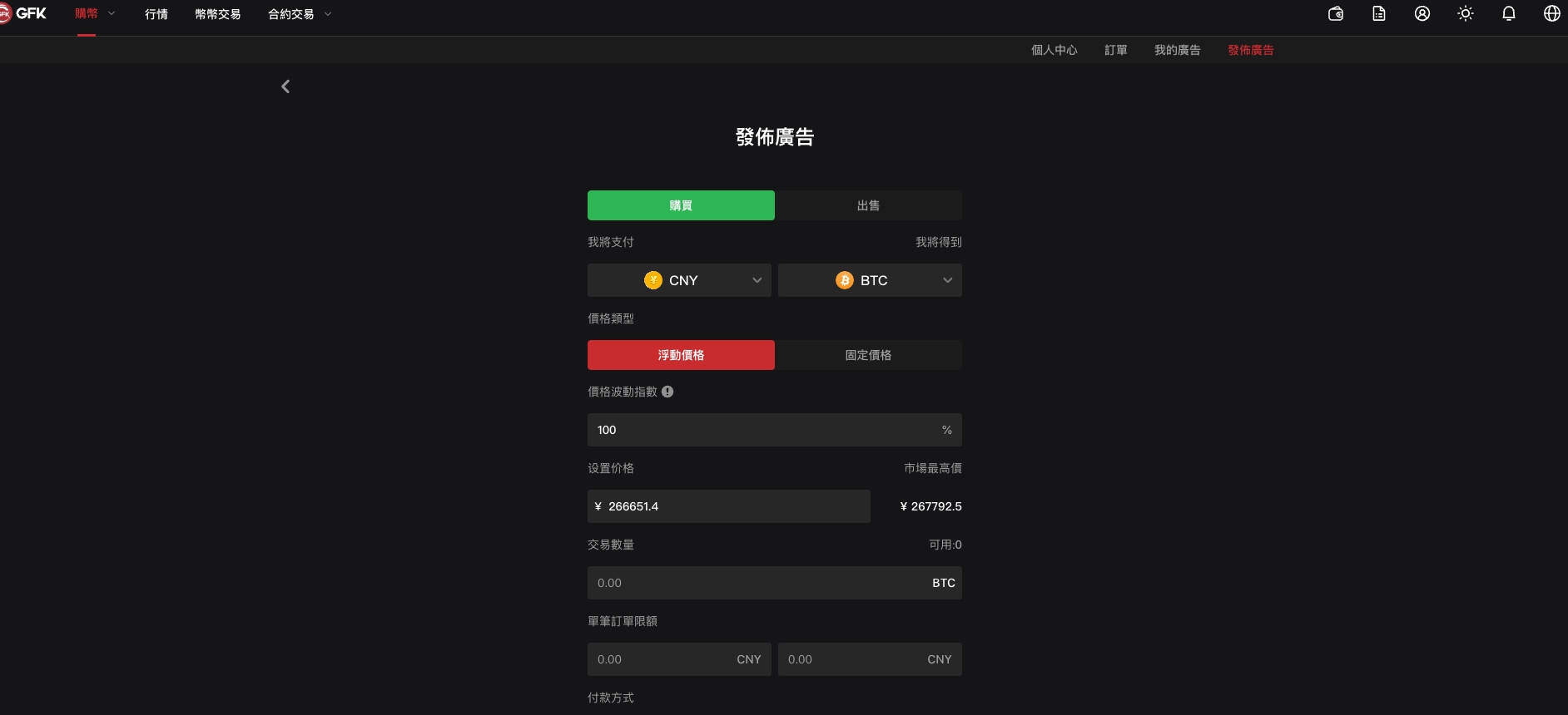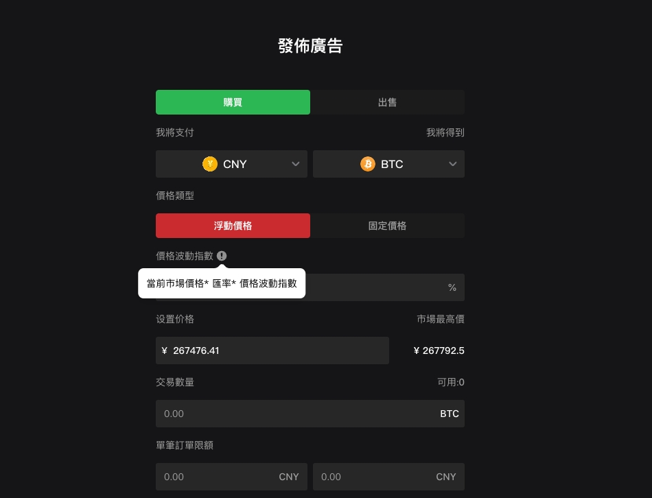 如果選擇【浮動價格】,則需輸入加密貨幣與法幣之間的匯率和浮動價格。 請註意,最終成交價格將根據您設置的浮動匯率或固定匯率計算。