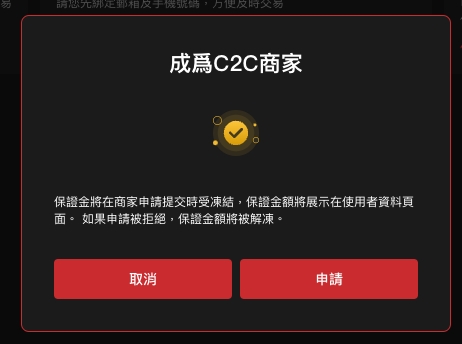 為了保證您的交易安全,申請成為C2C商家需要交易一定的保證金。申請提交後,您的保證金將暫時凍結。 若您解除商家身份,保證金將全額歸還。