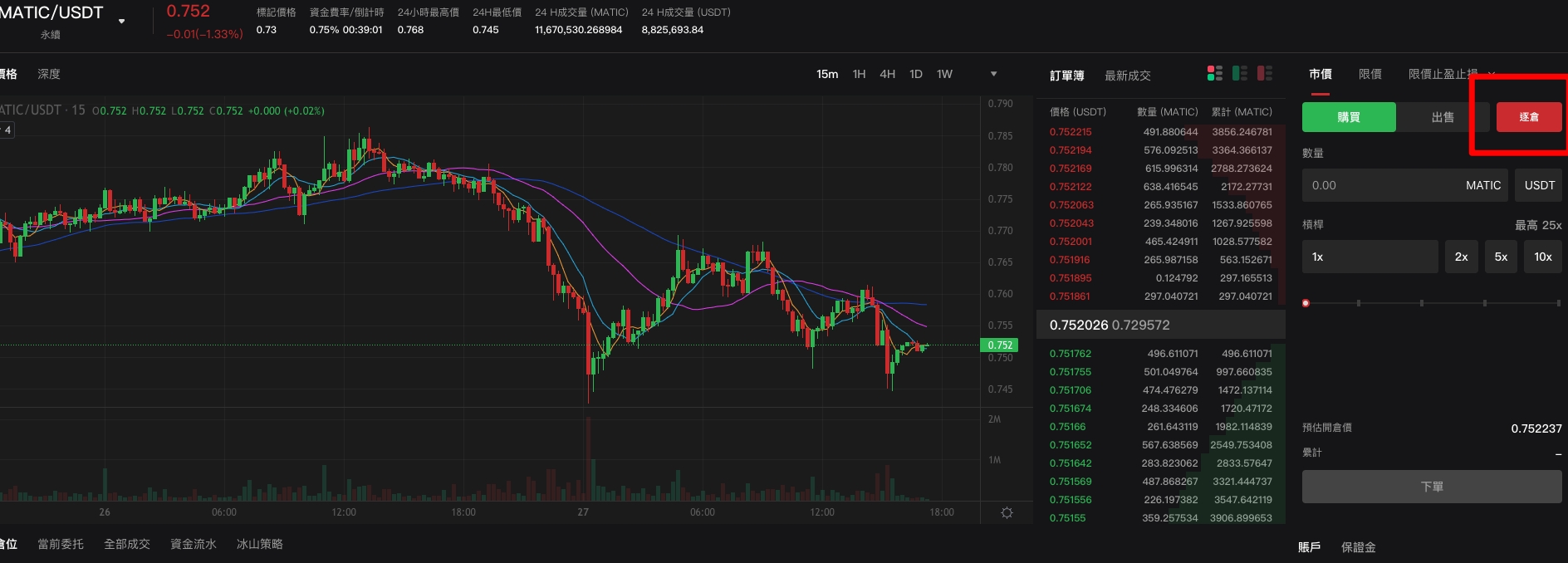 訪問合約交易界面,並點擊屏幕右上角的【逐倉】。
