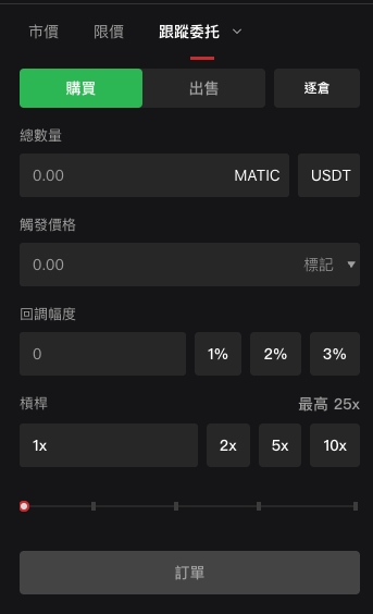 蹤委托單是用戶設定激活價格,和回調幅度的百分比後下的預設訂單。當市場波動滿足激活價格,平臺也不會立馬執行訂單,只要價格仍朝著有利於交易者的方向發展,其可使交易保持並繼續獲利來鎖定利潤。但是當價格往不利交易者方向移動達指定的百分比時,跟蹤委托單將以市價執行。