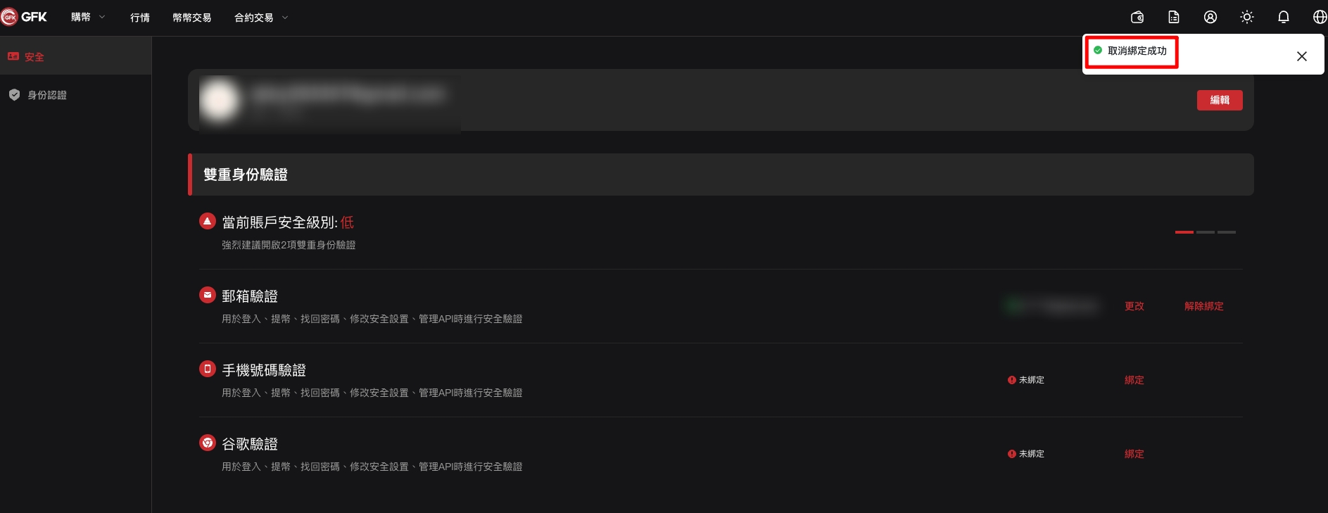為了保護您的資產安全,在GFK平台更改、解綁谷歌驗證器後,您的賬戶將禁用支付服務、提幣和C2C賣幣24小時。