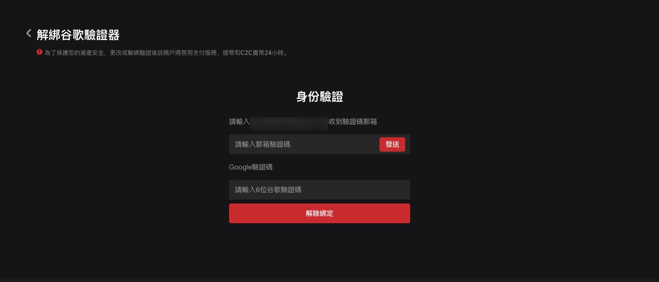 在解綁谷歌驗證之前,您需要通過安全驗證,請填寫郵箱/手機、谷歌驗證碼,並點擊「下一步」。