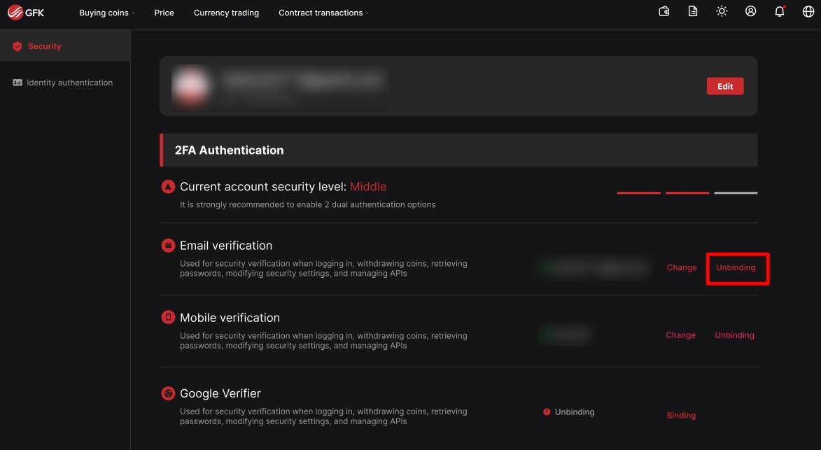 為了保護您的資產安全,在GFK平台更改、解綁手機號後,您的賬戶將禁用支付服務、提幣和C2C賣幣24小時。