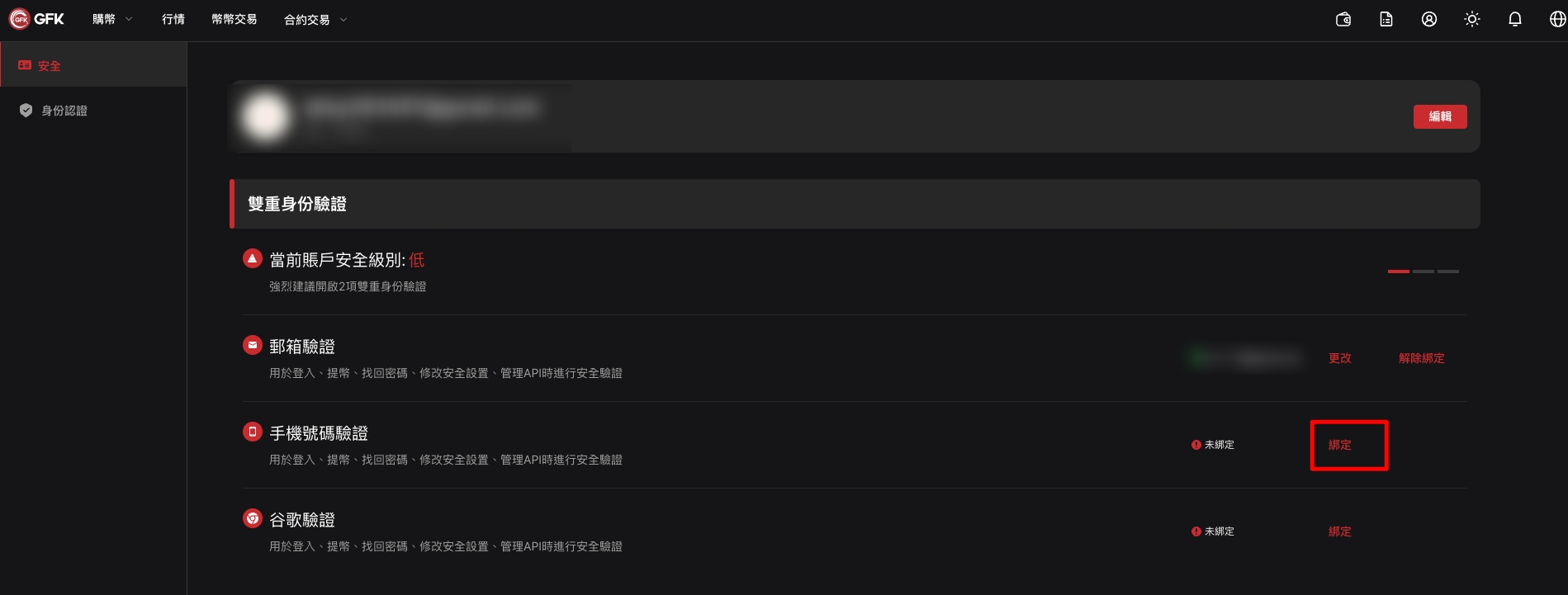 在這裡,您可以看到賬號的安全等級以及支持綁定的驗證類型:電郵、手機、谷歌驗證器。選擇「手機」進行綁定。