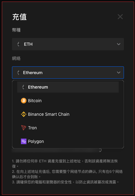 接著,請選擇充值網絡,確保所選網絡與提現平台的網絡保持一致。如果您選擇的網絡有誤,您的資金可能會丟失且無法追回。