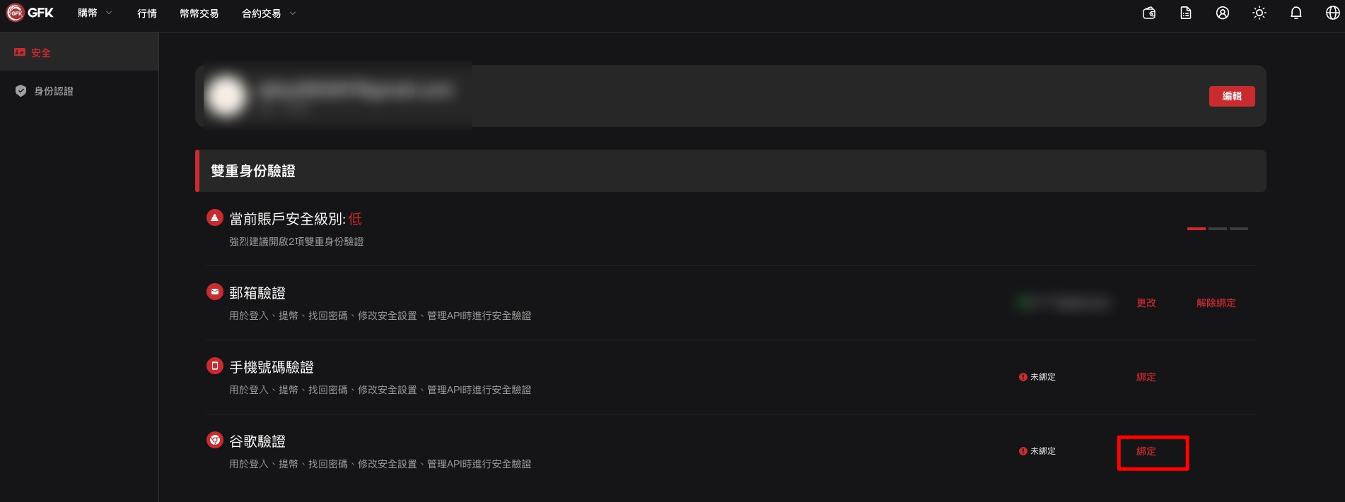 在這裡,您可以看到賬號的安全等級以及支持綁定的驗證類型:電郵、手機、谷歌驗證器。選擇「谷歌驗證器」進行綁定。
